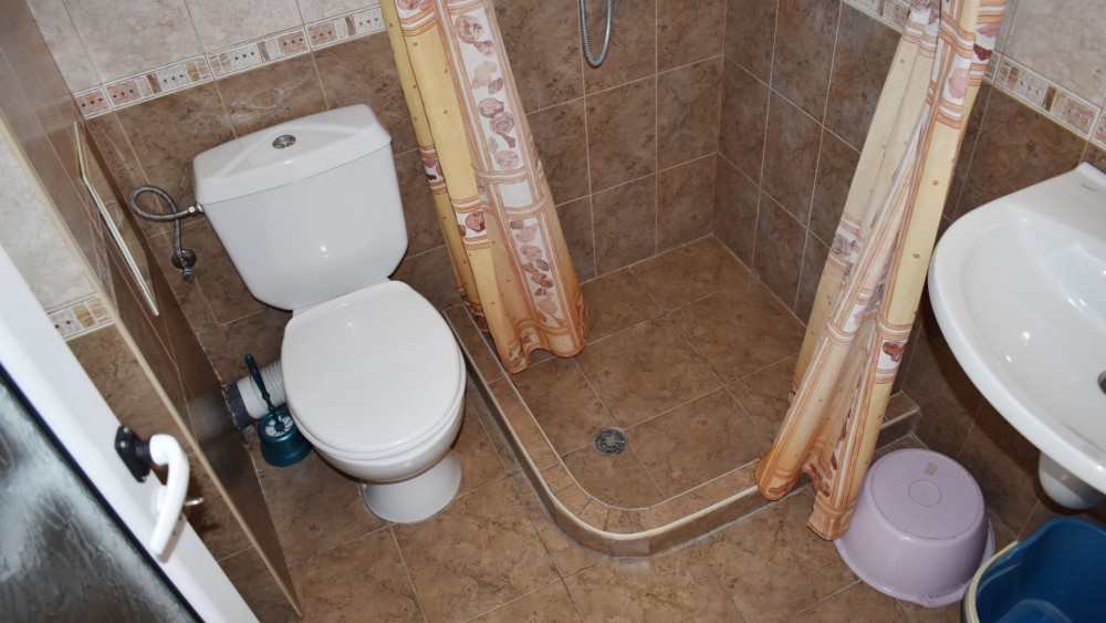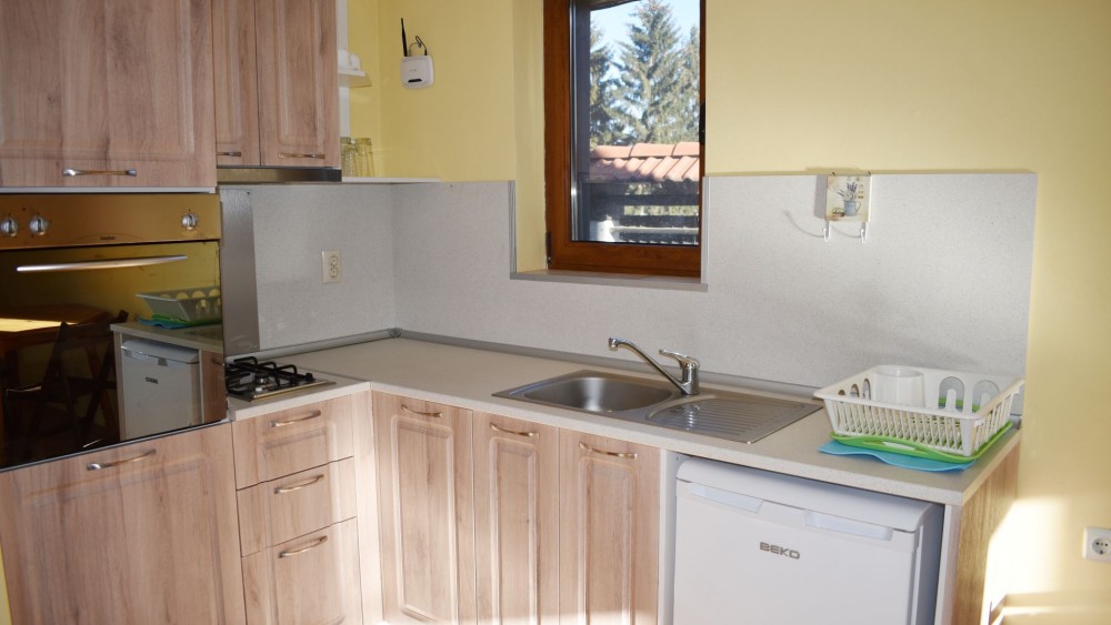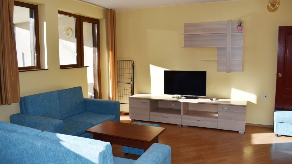 Апартаментът се намира на първи етаж в сграда с югоизточна гледка от прозорците и от терасата. Общата площ е 72 квадратни метра. Просторен и светъл хол с тераса с южно изложение, напълно обзаведен. Удобна ъглова кухня с прозорец, мека мебел, телевизор с плосък екран. От хола можете да отидете на терасата. Коридор свързва хола със спалнята и банята.