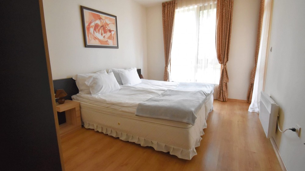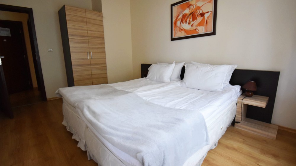 В спалнята — двойно легло, гардероб и нощни шкафчета.