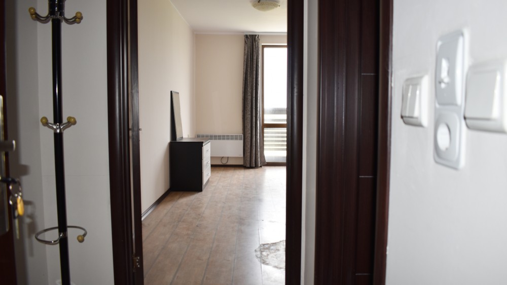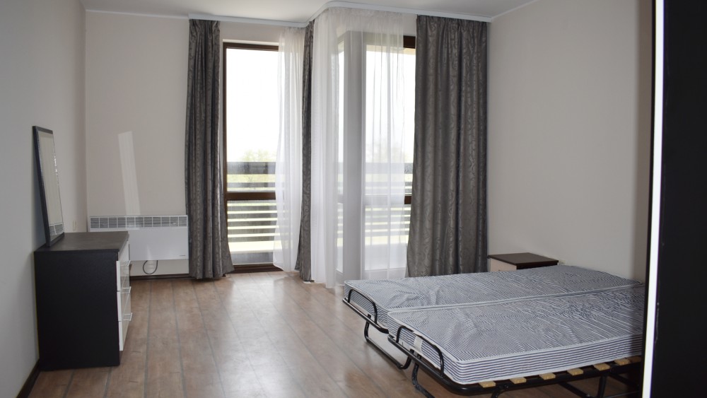 The studio is on the 2nd floor of the building with an elevator and controlled access. The apartment consists of an entrance-hall, bathroom with a bath and a spacious room with a balcony. The total area is 42 square meters. French windows to the floor visually increase space and give more light. The windows and the balcony offer a great view to the valley and the mountains. The apartment has all the communications like sewerage and water for building a kitchen.