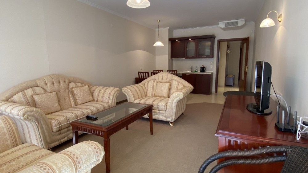 The living room is furnished with soft furniture, a coffee table, a sofa bed, and an armchair.