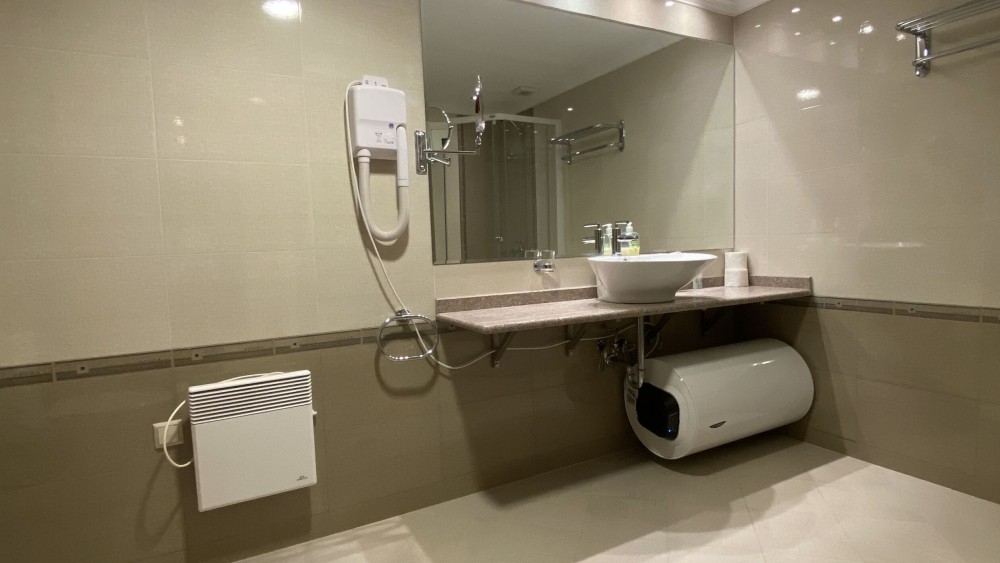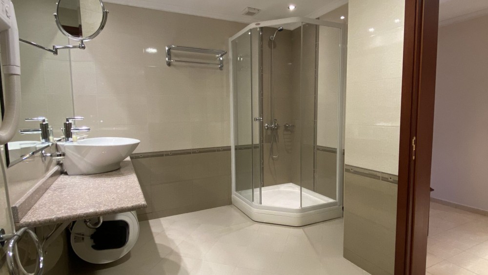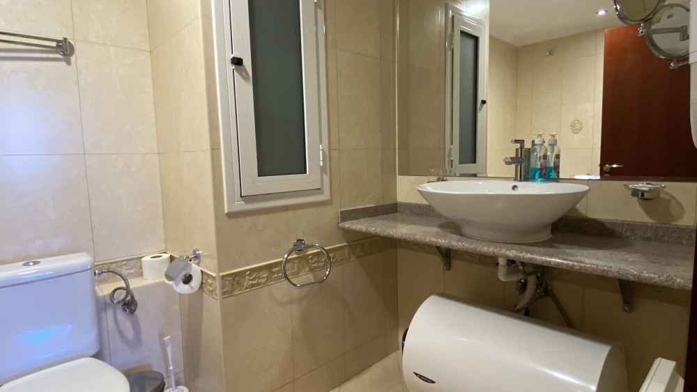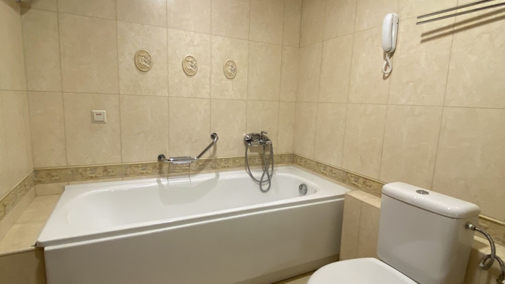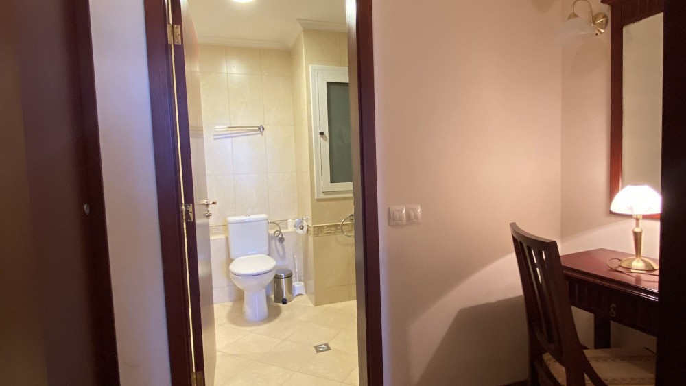 Bedroom two has a private bathroom with a bathtub and boiler. There is also a small closet with built-in wardrobes, a dressing table with a mirror, and a chair.