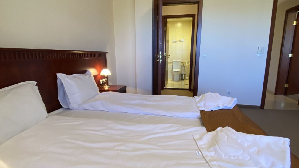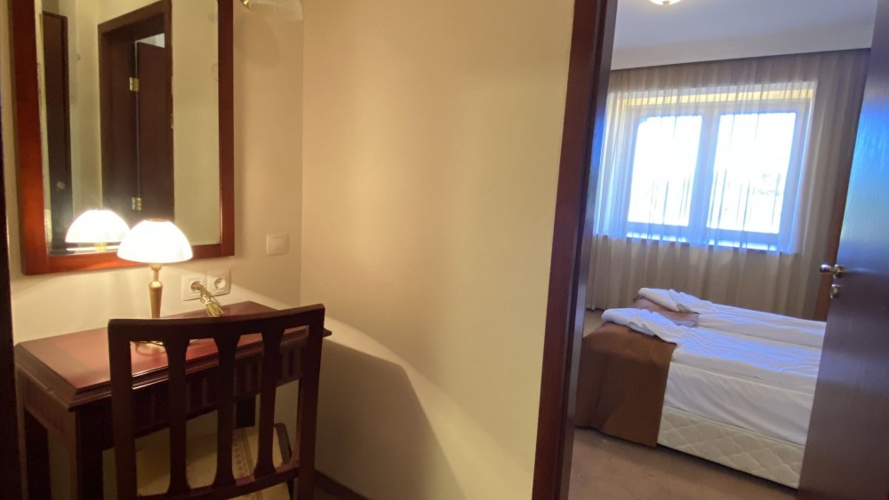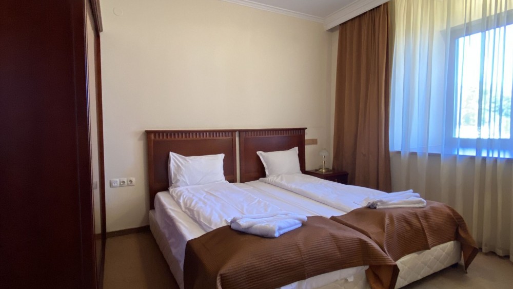 A bathroom with a bathtub is accessible from this room via a corridor. Bedroom one is furnished with a wardrobe, bedside tables, two single beds, carpeted floors, and latex walls.