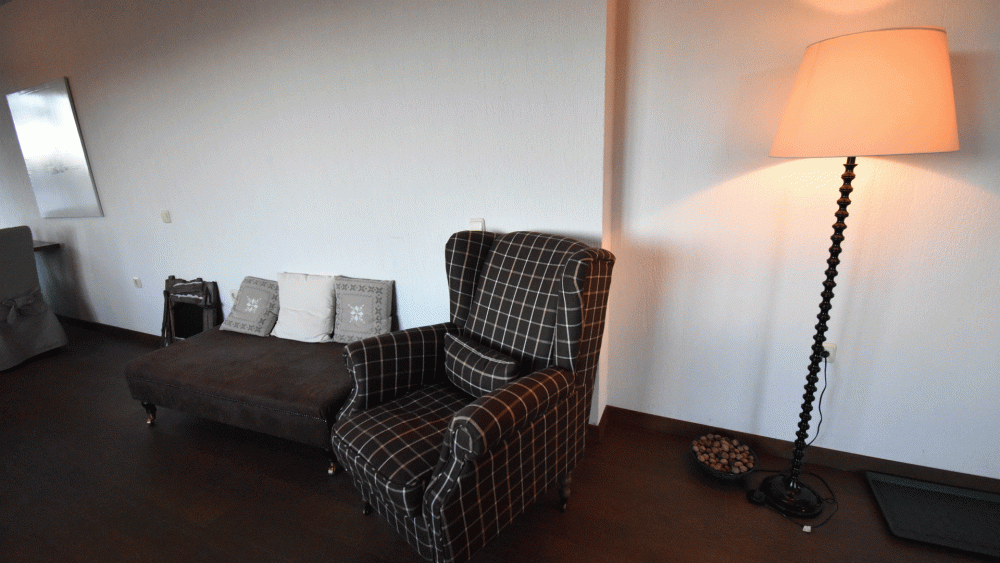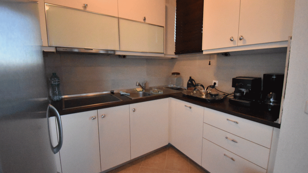 Layout: from the front door one enters a hallway which leads to a living room with sofas. The second room is currently furnished and used as a bedroom, fully furnished and equipped with a large bed, bedside tables, also west facing, like the lounge. The hallway leads into a large kitchen with space for dining, furnished and equipped with everything you need to move in immediately. From this room along a second corridor is the bathroom shower, sanitary and toilet.