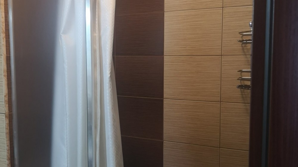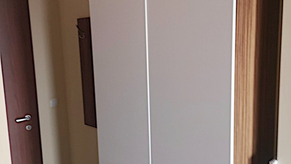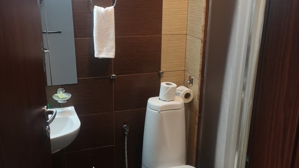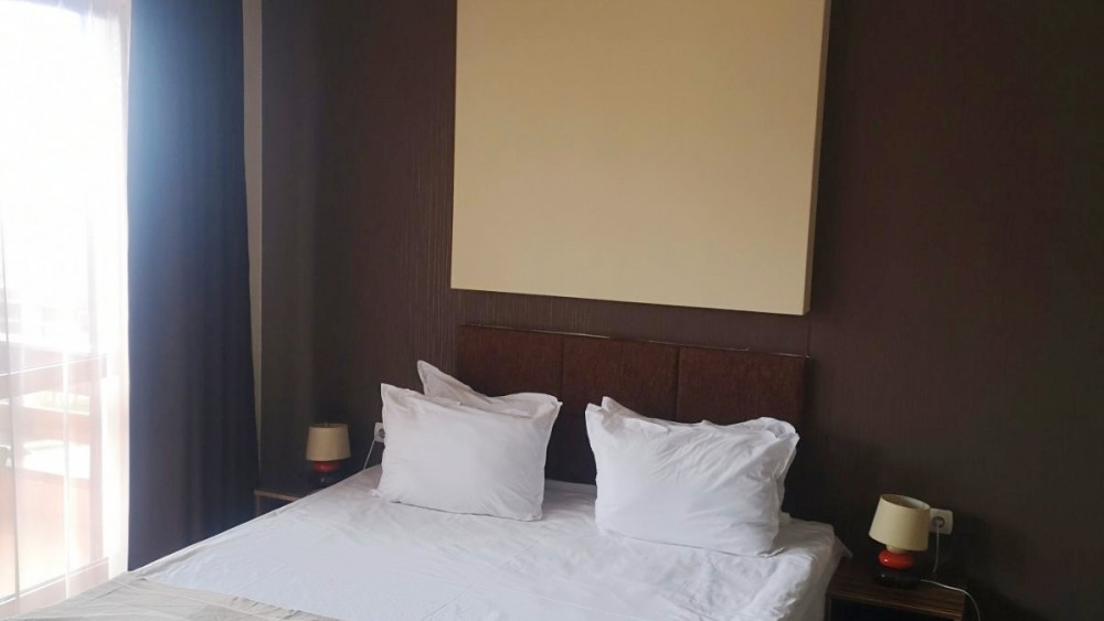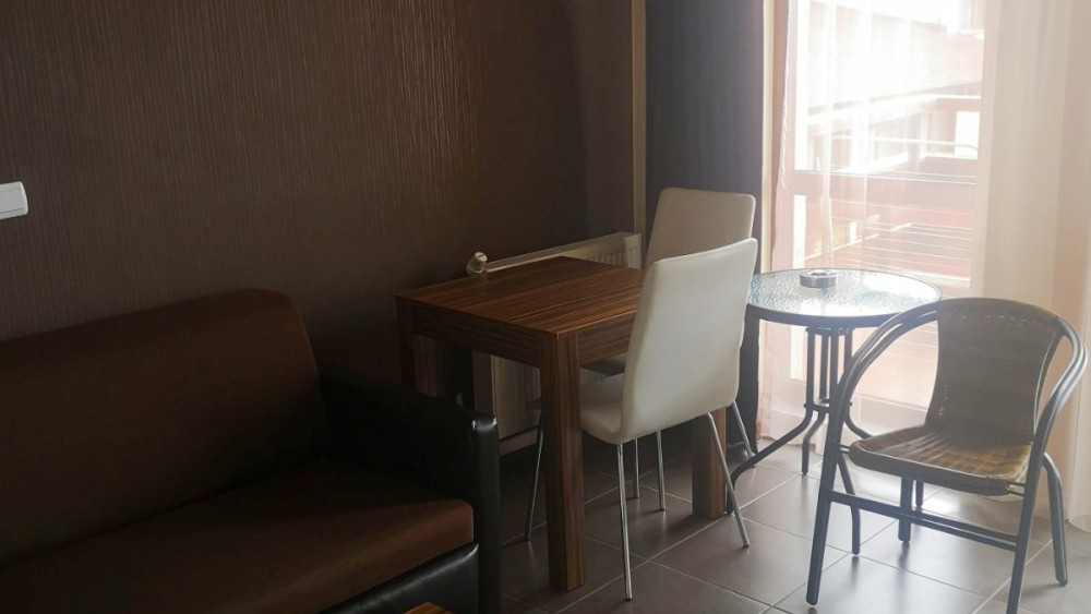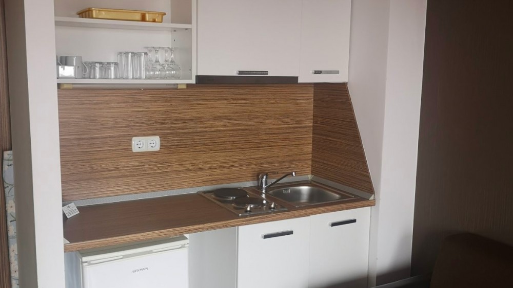The studio is located on the ground floor of the building and has a total area of 41 sq.m. It is fully equipped with furniture and appliances. There is a small kitchenette with cooker and refrigerator and a spacious double bed and sofa and a large walk-in wardrobe in the hallway area. The studio has an access to a large balcony with excellent views of the city and mountains. The bathroom has a shower cabin.