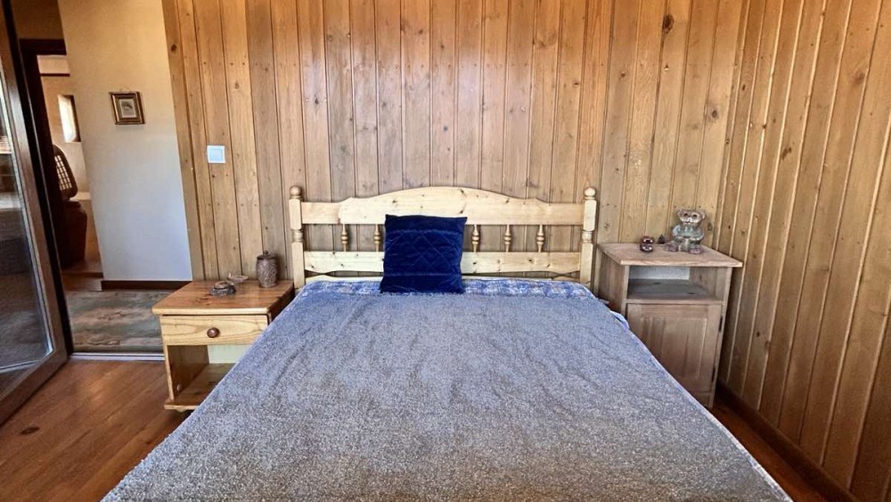 The living room is furnished with soft furniture and a coffee table. The exposed beams on the ceiling are impressive and add charm to this room. Wooden stairs lead to the second floor, where there are three separate bedrooms, fully furnished, as well as a closet. The bathroom is finished with a boiler, shower, and shelves for cosmetics.
