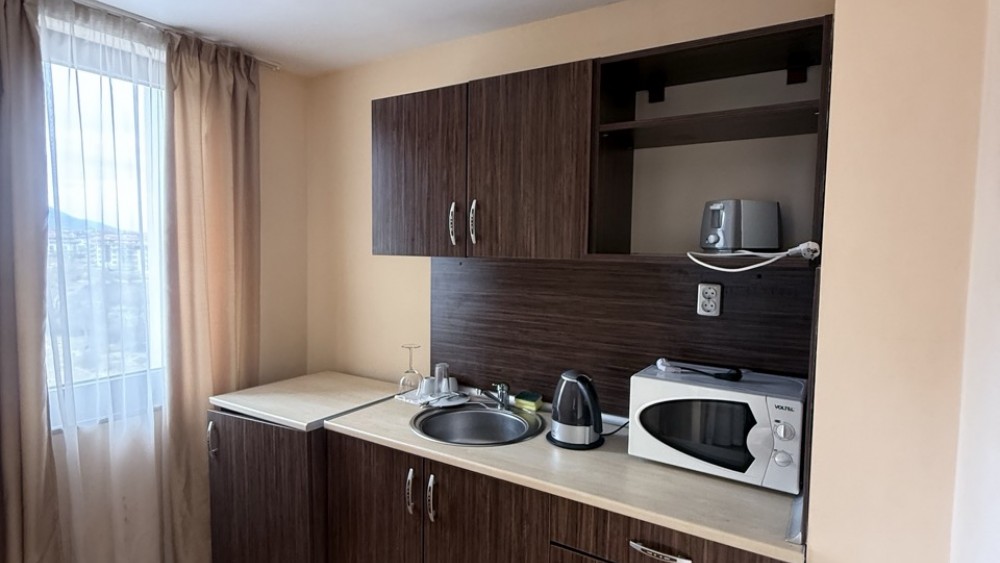 • кухненски кът с горни и долни шкафове и микровълнова фурна