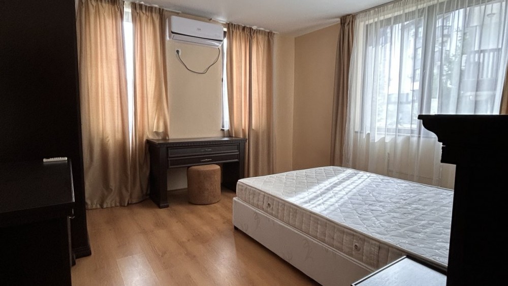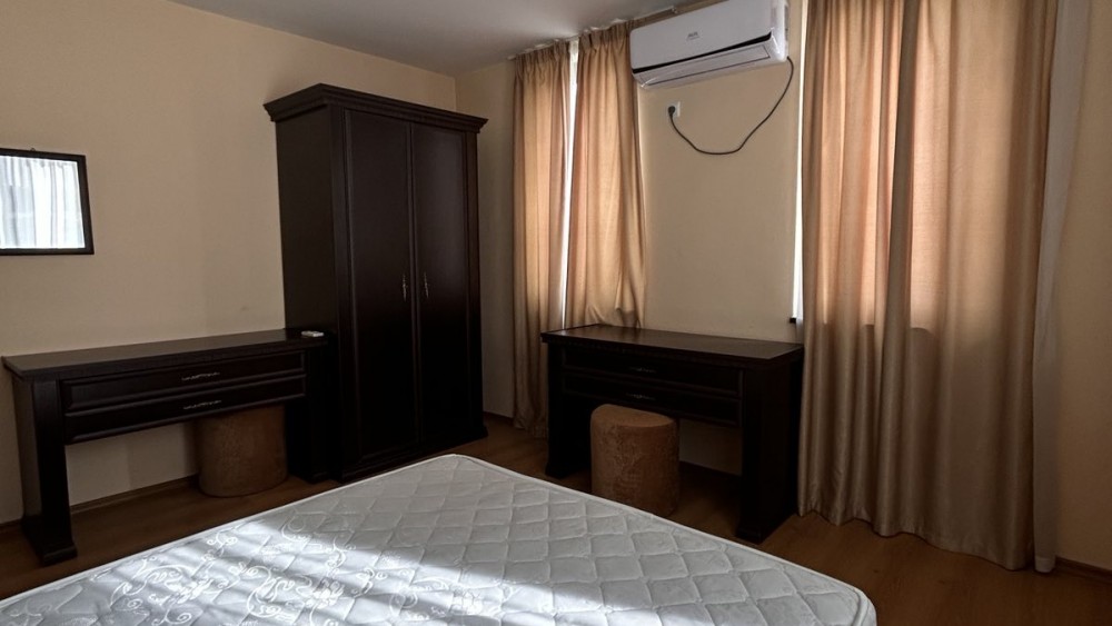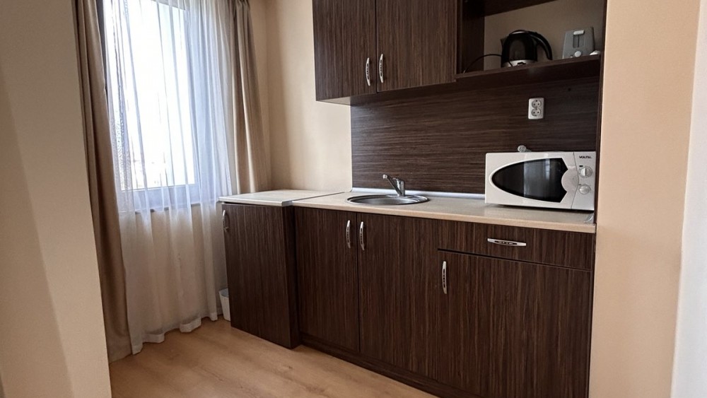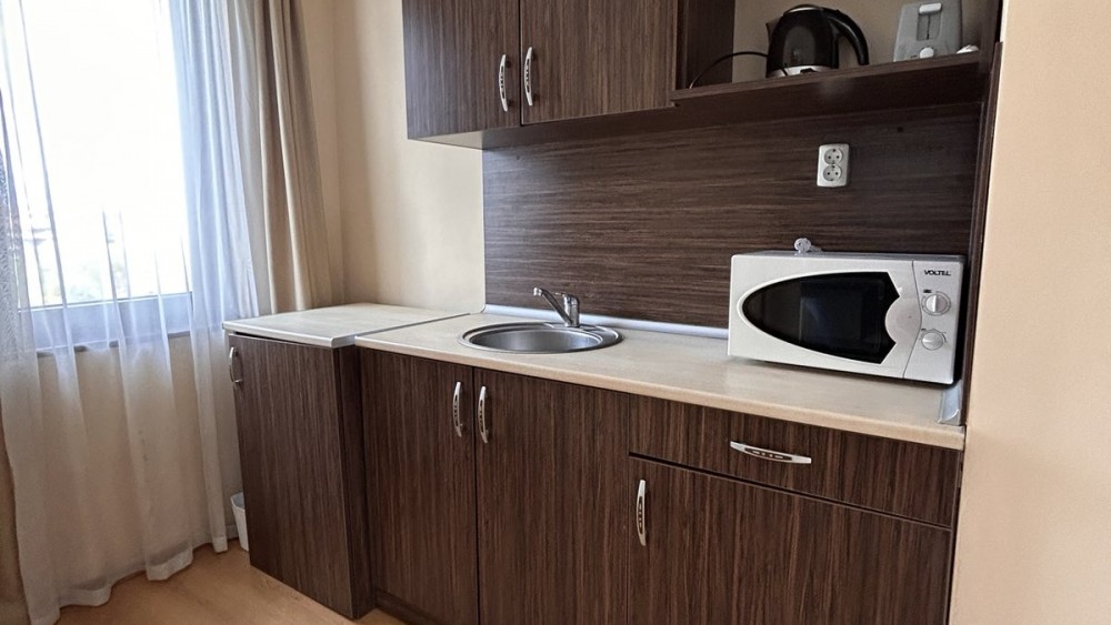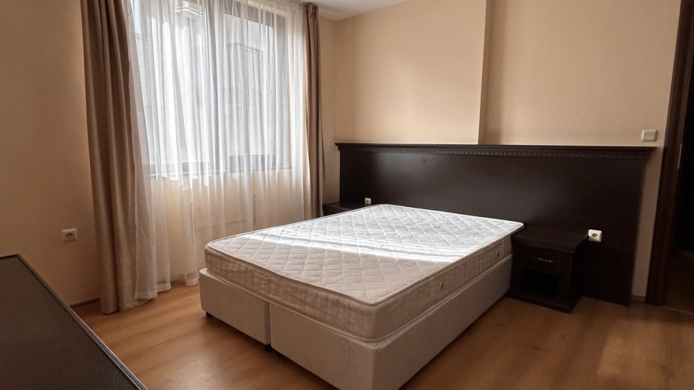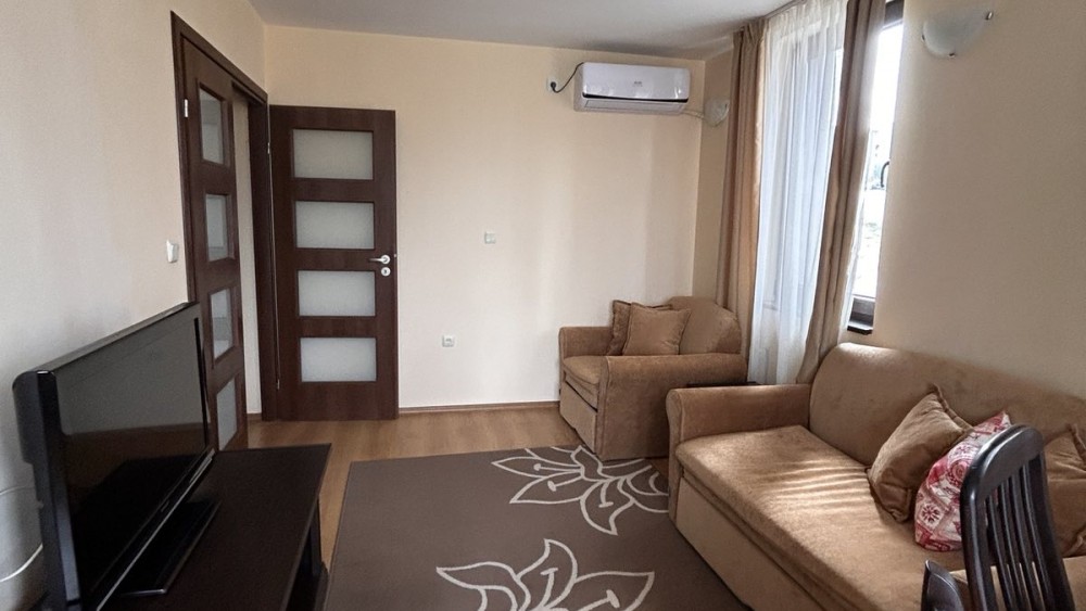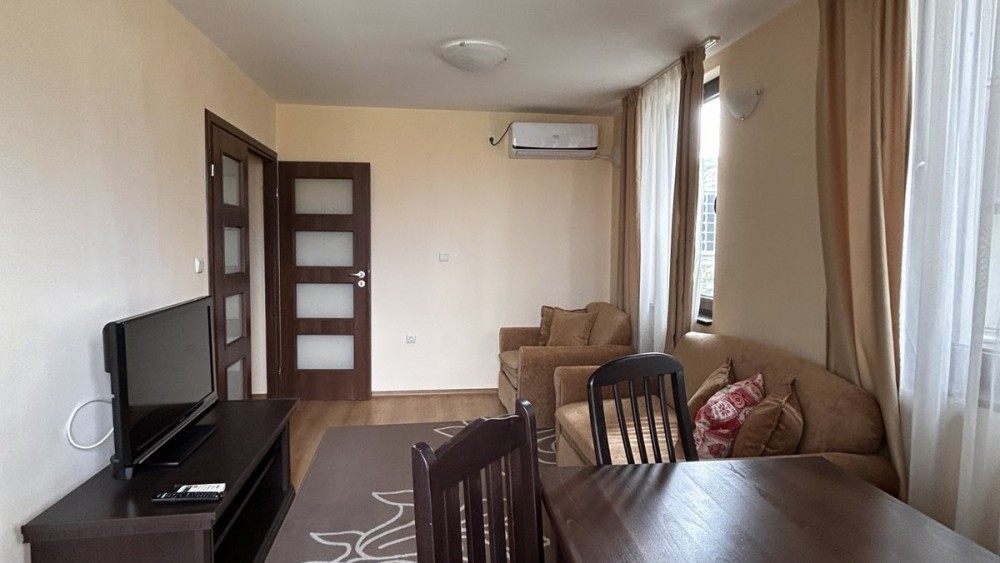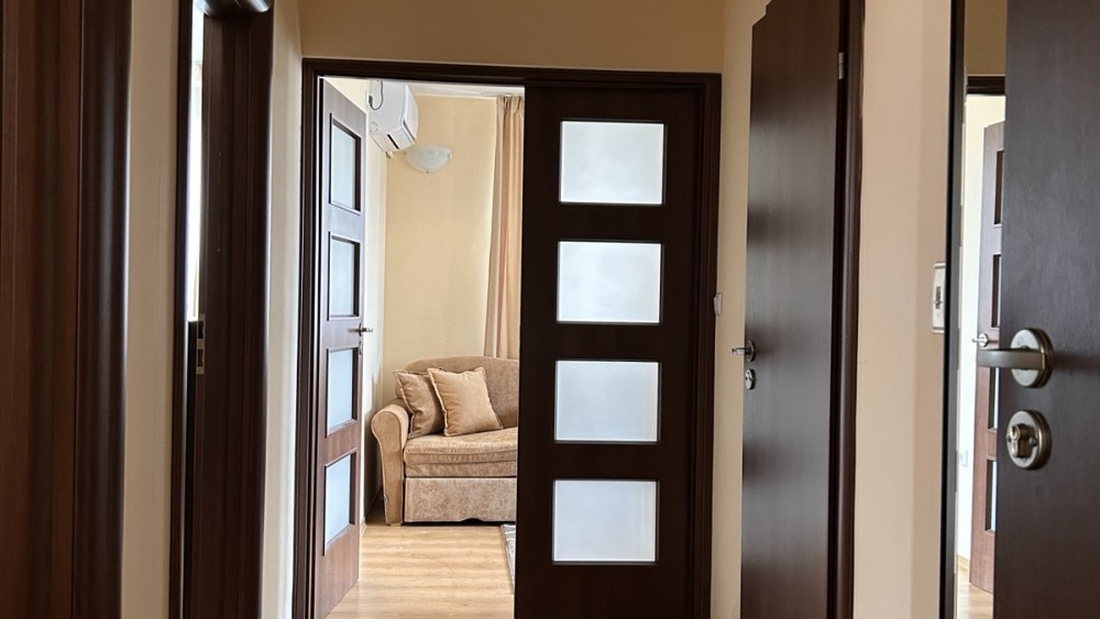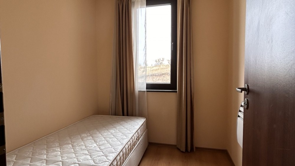 Разпределение: входно антре със закачалка и място за обувки. Малка всекидневна завършена с разтегателен диван и холна масичка, кухненския кът е завършен с горни и долни шкафове, мини фурна, котлони, абсорбатор. Две непреходни спални с общ балкон с вид към планината и следното обзавеждане: спалня 1: е по-малка като квадратура и е подходяща за детска стая. В момента е обзаведена с голямо двойно легло и нощни шкафчета. От тази стая се открива директна гледка към планината. Спалня 2. е по-голяма и е завършена с голям гардероб и голямо двойно легло с нощни шкафчета и лампи. Банята е завършена с душ, мивка, теракота и фаянс и тоалетна.