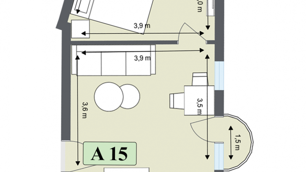 От входното антре се влиза в просторна дневна с приблизителни размери 3,6 м × 3,9 м, където е предвидена зона за отдих с диван и холна маса. Пространството позволява удобно посрещане на гости и ежедневен комфорт.