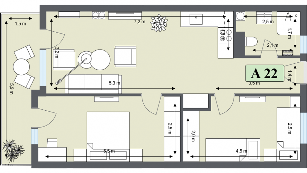 дневната зона (всекидневна с кухня и тераса) е отделена от приватната част с двете спални, което създава комфортно пространство за живот на цялото семейство.
