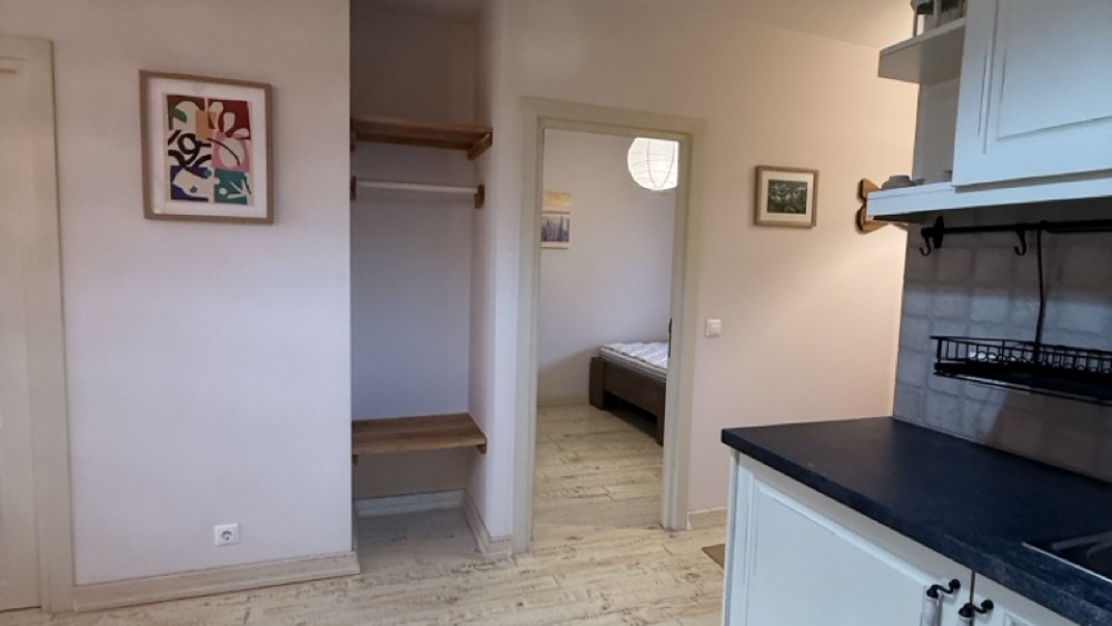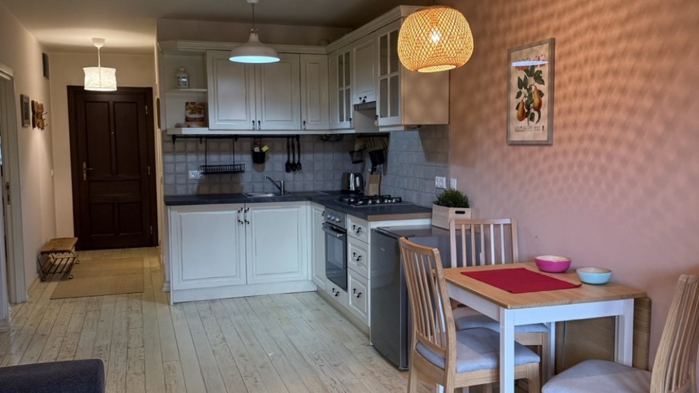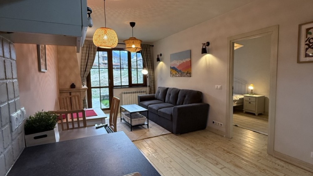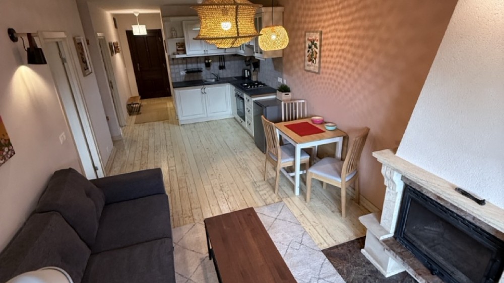 Разпределението включва уютна дневна с кухненска зона и място за отдих, отделна спалня, модерна баня и входно антре с възможност за организиране на пространство за съхранение. Интериорът позволява удобно обособяване както на трапезарна зона, така и на зона за релакс.
