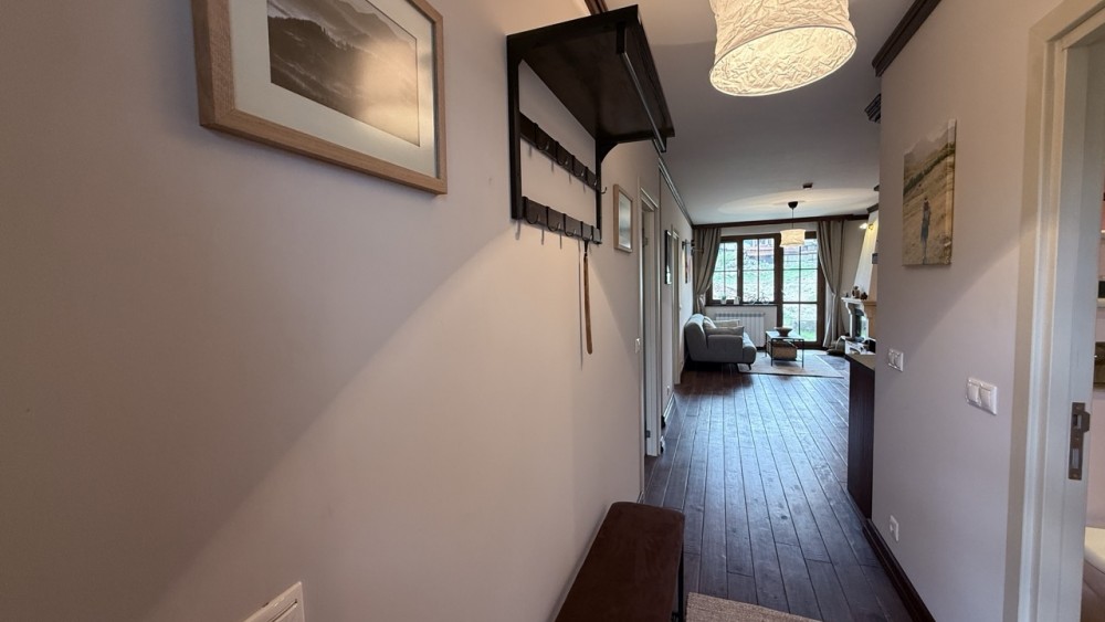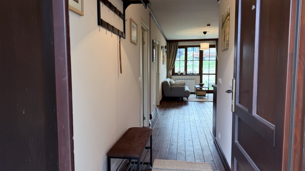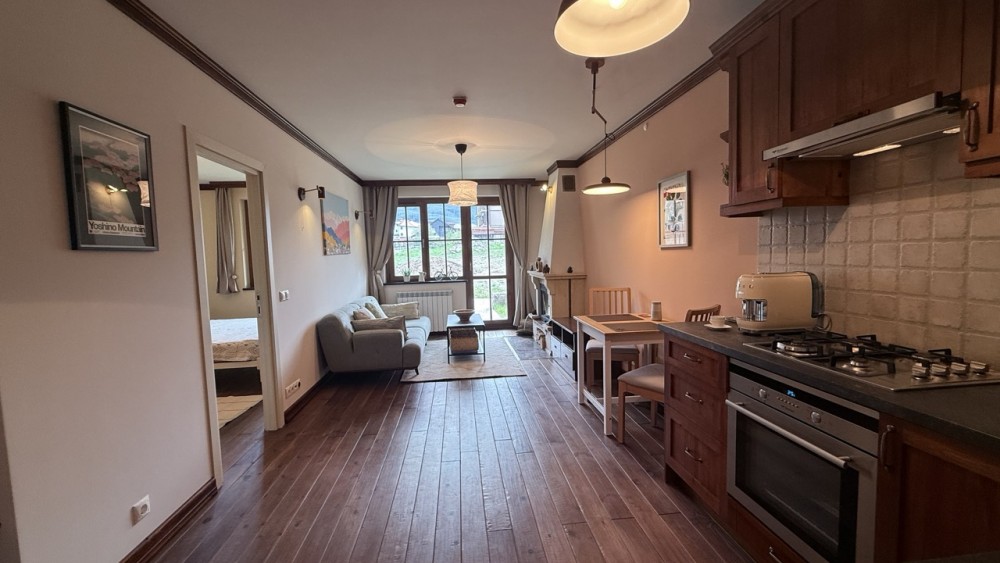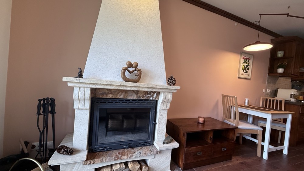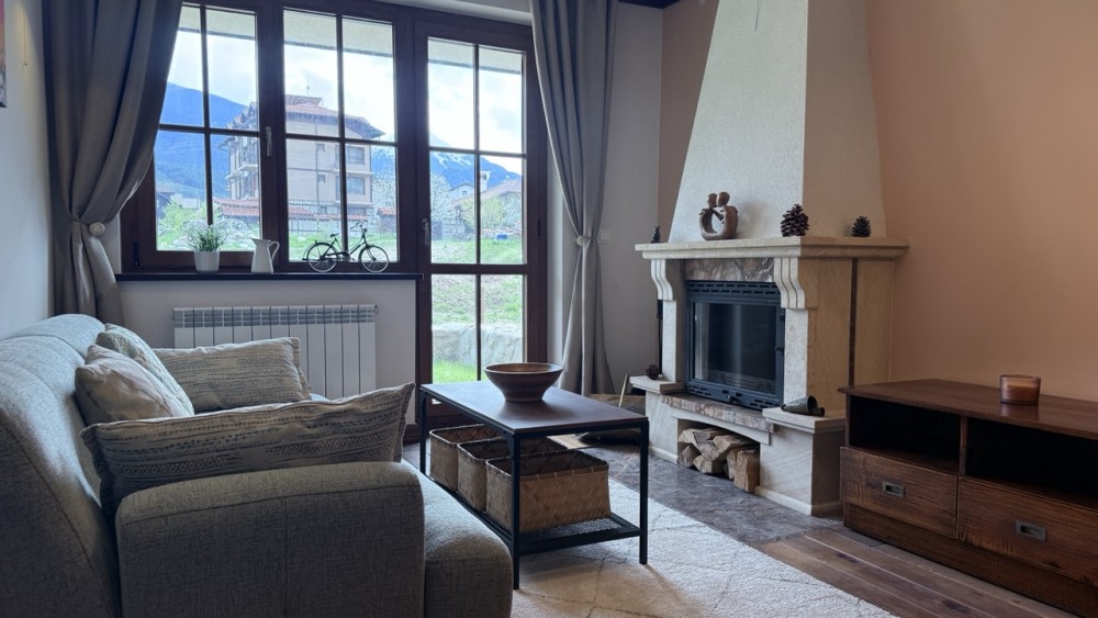 Просторната всекидневна е обединена с кухнята, създавайки едно живо и хармонично пространство. Големите прозорци и изходът към терасата изпълват помещението с естествена светлина, а камината добавя онова усещане за планински уют, заради което хората идват в Банско.