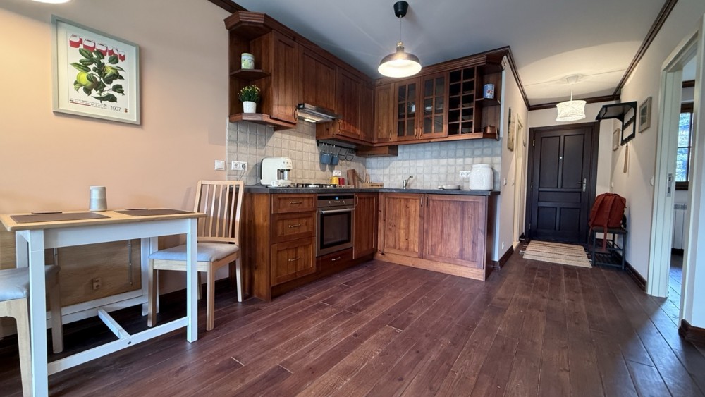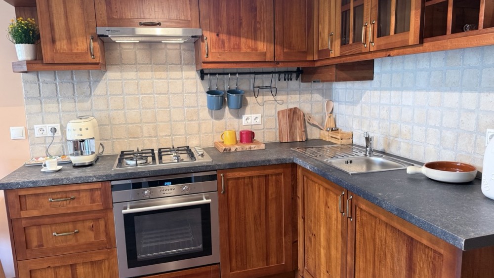 Кухнята е изпълнена в класически стил от естествено дърво и е напълно оборудвана с необходимата техника: котлони, фурна, абсорбатор, хладилник и мивка. Има удобна трапезна зона — както за закуска за двама, така и за вечеря с чаша вино след каране.