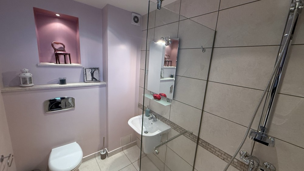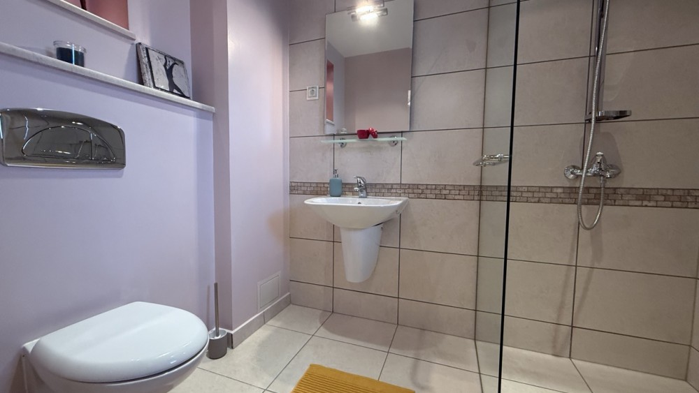 Банята е модерна, с душ кабина, качествена санитария и добре обмислени ниши за съхранение.