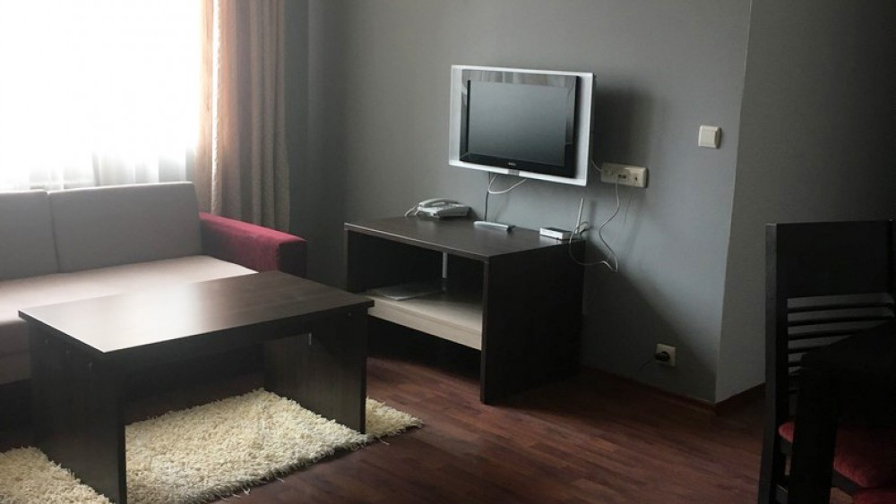 Предлагаемая на продажу квартира находится на третьем этаже и полностью ориентирована на юг. Небольшая прихожая ведет в просторной гостиной с кухней, которая обставлена по стандартам отеля. Ванная комната оборудована душевой кабиной. Спальня оборудована двухспальной кроватью, прикроватными тумбами, шкафом для одежды. Из спальни есть выход на красивую террасу с видом на горы и внутренний благоустроенный и ухоженный двор комплекса. Общая площадь квартиры 65 кв.м.