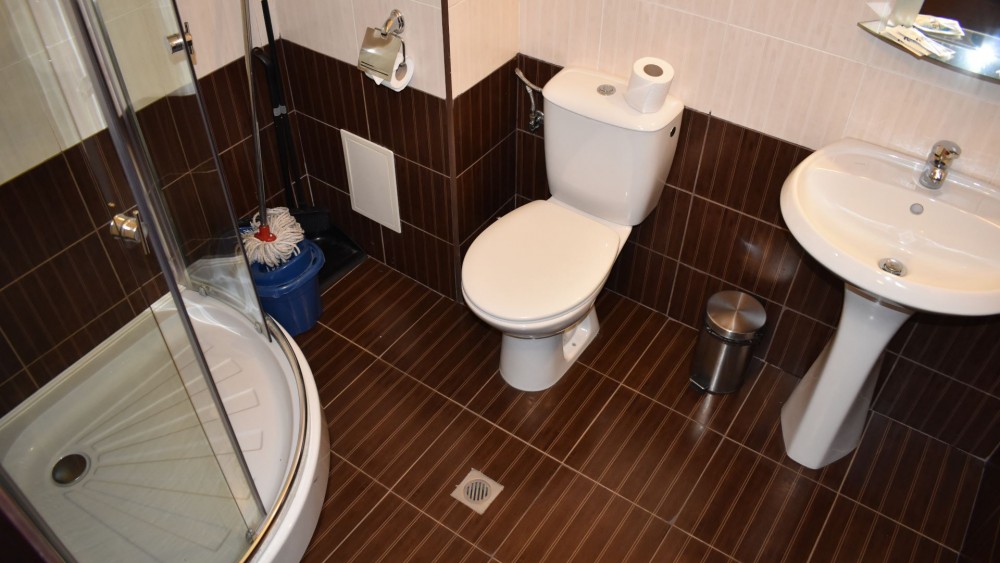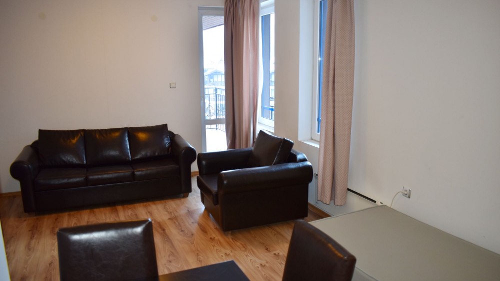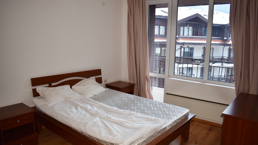 Апартаментът, който продаваме в Банско, се намира на третия етаж в пет етажна сграда. Имотът предлага уникални южни гледки от прозорците и от балкона към планината и гората. Общата площ е 65 квадратни метра. Апартаментът е напълно оборудван с всички необходими мебели и уреди. Разположението на апартамента включва антре, хол с кухненски бокс, спалня, балкон и баня с душ. Кухнята е оборудвана с фурна, печка, микровълнова печка, абсорбатор. В хола има мека мебел от кожа. Просторна спалня с двойно легло и гардероб.
