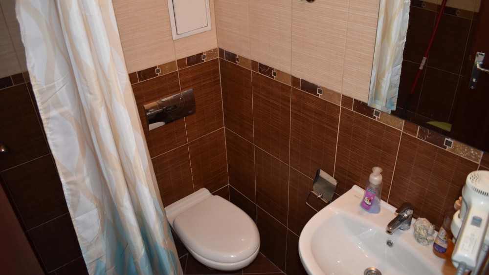Имотът се намира на втори етаж с обща площ от 35 кв.м. Продава се обзаведен с дървен гардероб, нощни шкафчета, голямо легло, бюро, огледало. Банята е оборудвана с душ, мивка, огледало. Под-ламинат, стени-латекс, теракота в банята.